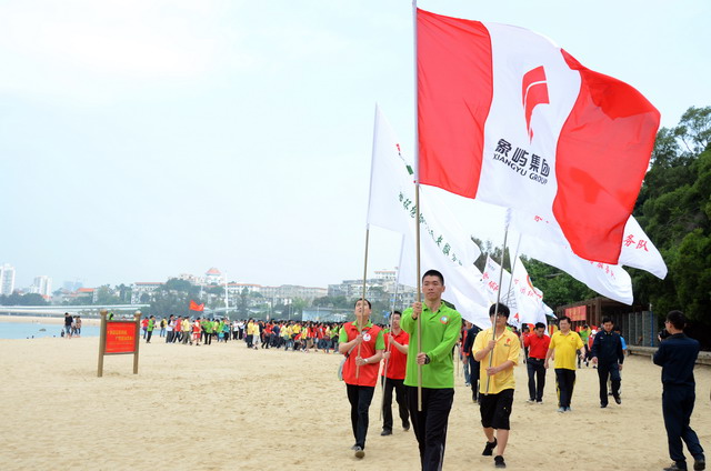 活動啟動儀式上,集團公司黨委副書記、工會主席陳偉彬代表集團領(lǐng)導(dǎo)班子向共建單位代表及全體員工致以節(jié)日的問候!陳副書記表示,我們要尊重勞動、謳歌勞動者;我們要倡導(dǎo)運動,褒獎優(yōu)勝者;我們崇尚遠(yuǎn)大的理想,憧憬美好的未來。海軍南方局李躍峰副政委對象嶼集團在勇?lián)鐣?zé)任、傳承愛心善行方面所作的努力高度贊揚,并表示這對深入培育當(dāng)代革命軍人核心價值觀方面具有十分積極的推動促進作用。隨后進行了“象嶼集團縱走俱樂部”授旗儀式,集團總裁張水利為縱走俱樂部授旗,號召更多縱走愛好者“走在一起,樂在一起”!集團及海軍南方局領(lǐng)導(dǎo)、十佳員工及志愿者代表鳴槍發(fā)令,全體人員在司旗的帶領(lǐng)下,向著音樂廣場出發(fā)了!